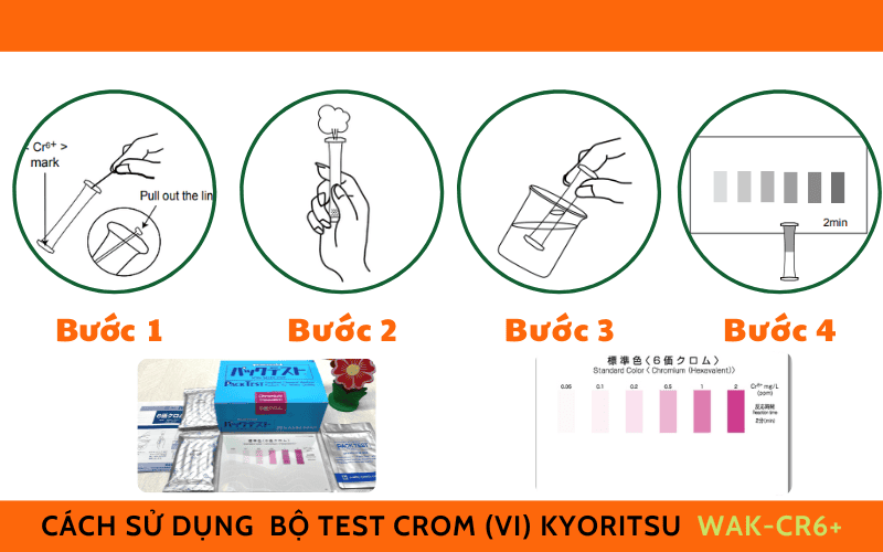 Bộ kit test Crom WAK-Cr⁶+ của Kyoritsu giúpTest nhanh crom (VI) trong nước thải cũng như nước sản xuất xi mạ với dải đo 0 2.0 ppm. Bộ test cho kết quả nhanh chóng, thực hiện đơn giản, không cần thiết bị và dụng cụ kèm theo rất thích hợp cho kiểm ra ngoài hiện trường với chi phí thấp.